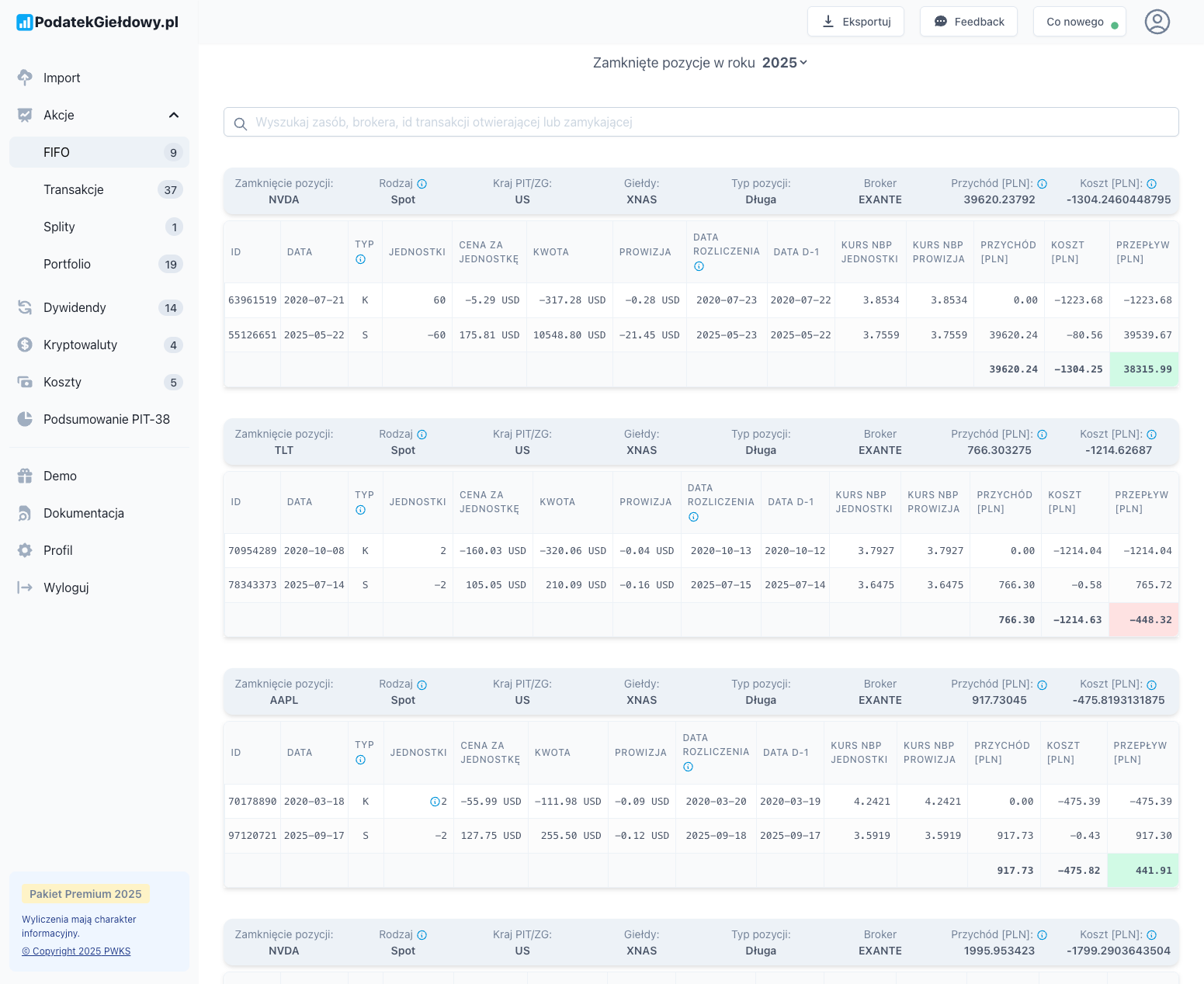 Wersja darmowa pozwala przetworzyć do 40 transakcji rocznie i działa jak pełnoprawny kalkulator giełdowy do PIT-38. Możesz sprawdzić import, obliczenia, waluty NBP, FIFO i raport PDF. Jeśli masz większy portfel lub chcesz więcej funkcji, możesz przejść na Premium w dowolnym momencie.
